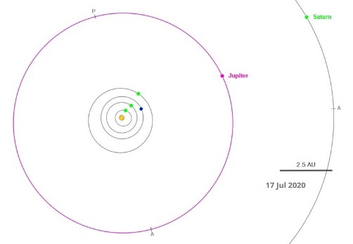 Jako první se na opačnou stranu od Země vůči Slunci dostane obří Jupiter. Jak už bylo naznačeno, projde planetární polohou, kterou nazýváme opozice a současně se nejvíce přiblíží Zemi, což s ohledem na nebeskou mechaniku nejsou přesně shodné pozice jeho dráhy. V každém případě z toho ale plyne to, že v opozici, jejíž přesný okamžik byl stanoven na dopoledne 14. července 2020 (7:46 UT), bude jeho polokoule, přivrácená k naší planetě, celá ozářená Sluncem. Nejmenší distancí od Země pak planeta projde až o den později, dopoledne 15. července 2020 kolem 9. hodiny UT. To se můžeme těšit na disk planety vzdálené od nás 619,4 milionu km (4,139 au) o průměru 47,6“ a s jasností -2,7 mag.