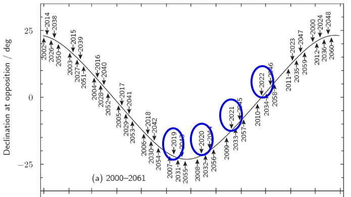 Výše uvedené parametry vzhledu planety samozřejmě odpovídají optimu dosažitelného. Vždyť jen o trochu větší zdánlivý průměr a nepatrně vyšší jasnost měl Jupiter naposledy při opozici na začátku prosince 2012. Leč přeci jen nás čeká jedna nepříjemnost. Planeta se na své dráze při pohledu za Země promítá do východní části zvířetníkového souhvězdí Střelce blízko hranice s Kozorohem. To jinými slovy znamená, že její deklinace je velice nízká. To samozřejmě nepřispívá, ve střední zeměpisné šířce severní polokoule, kde se nachází Česká republika, k její dobré pozorovatelnosti. Na připojeném obrázku je znázorněno rok po roce v jaké deklinaci je Jupiter v čase opozice se Sluncem. Je zřejmé, že právě opozice v letech 2019 a 2020 jsou těmi nejproblémovějšími. Takže pokud si pohledu na největší disk planety budete chtít co nejlépe užít, znamená to počkat si s pozorováním až na čas její kulminace, která s ohledem na zavedený letní čas, nastává až kolem 1 hodiny SELČ. I tak se Jupiter dostane nad jihem do výšky kolem pouhých 18°.