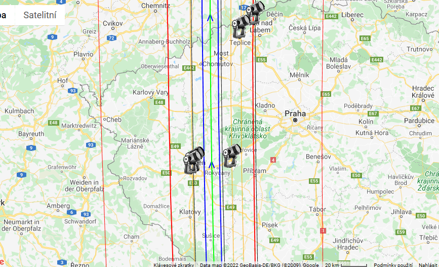 Pás stínu široký asi 12 kilometrů (modré linie v připojeném obrázku) by měl protnout naše území od jihu k severu přibližně po trase Sušice – Rokycany – Jesenice – Most. Na této centrální linii je pravděpodobnost spatření úkazu kolem 16 %. Určitě má ale smysl pozorovat i z oblasti do 1-sigma (silné červené čáry), kde je stále ještě slušná šance kolem 8 %. Ideální by samozřejmě bylo rozestavit linii pozorovatelů po cca 7 – 10 km od Chebu po Tábor. V takto hustých „hrabičkách“ by Bambery téměř jistě uvízla, ale to není reálné. Proto touto informací vyzýváme každého potencionálního zájemce ke spolupráci. Je zcela evidentní že má smysl každé jednotlivé pozorování v podstatě z celých Čech. Pokud chcete poradit s výběrem místa (abyste nebyli na stejné linii s dalším pozorovatelem), napište na halir(at)hvr.cz.