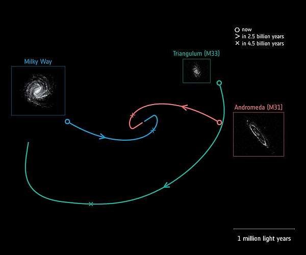 Druhá polovina simulací přináší ještě optimističtější scénář, při němž se galaxie minou natolik vzdáleně, že to nebude hrát prakticky žádnou roli pro jejich osudy. Na připojeném obrázku (Daniel Lawler, Paris (AFP) June 2, 2025) je schematické znázornění pohybu galaxií (včetně M 33 v souhvězdí Trojúhelníku) v nadcházejících miliardách (v angličtině billions) let.
