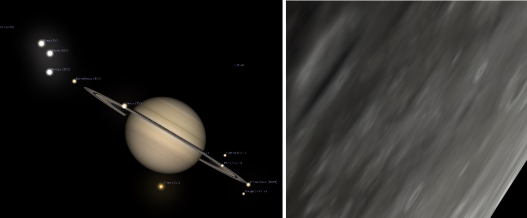 Kolem 18. hodiny se Saturn promítá ještě vysoko na jihozápadní oblohu (h 19,5°; A 242°) a zapadá až krátce po 20. hodině SEČ. Na jeho sledování tak máme k dispozici už i začátek skutečné astronomické noci, se Sluncem v hloubce pod -18° vůči obzoru, která začíná v 19:17 SEČ.