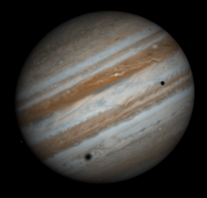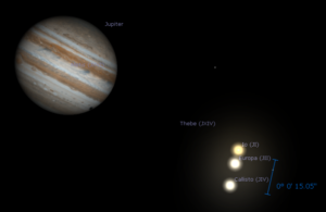 Již v 18:36 SEČ se na okraji Jupiterova kotouče objeví stín Europy a v 19:55 SEČ se k němu připojí stín dalšího z galileovských měsíců – Callisto. Po dobu 91 minut budeme mít možnost pozorovat dva „flíčky“ na horních vrstvách atmosféry vlastní planety. Poté (ve 21:26 SEČ) zmizí stín Europy, která se začne připravovat na druhé setkání. Čekání na něj si můžete až do 23:57 SEČ ukrátit sledováním putujícího stínu Callisto. Jen o čtyři minuty později, přibližně minutu po půlnoci, se vedle Jupitera seřadí do „trojtečky“, dlouhé 15 úhlových vteřin, tři z jeho měsíců. K účastníkům předchozího stínového představení (zdola Callisto, Europa) se „nahoře“ přidá opačným směrem rychle se pohybující měsíc Io.