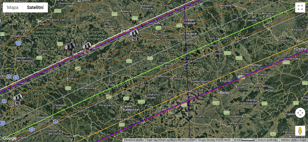 A odkud má cenu se dívat? Pás předpokládaného zákrytu široký 137 km se téměř vejde mezi čtyři naše největší města – na jedné straně Plzeň a Prahu a na druhé Brno a Ostravu. Zelená čára v mapě představuje centrální linii, modré čáry okraje předpovězeného pásu a červené chybu 1-sigma (malá vzdálenost modré a červené = předpověď je velmi přesná).