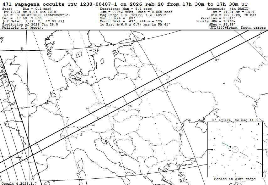 V pátek večer, 20. února 2026 mezi 17:35:40 a 17:35:52 UT, protne, dle předpovědi, naše území pás stínu 127 km velké planetky (471) Papagena. Ta z našeho pohledu zakryje relativně jasnou hvězdu TYC 1238-00487-1 (10,3 mag.) v souhvězdí Býka. Úkaz se odehraje vysoko nad JJZ obzorem (azimut 204, výška 56 stupňů) a měl by být v dosahu i menších dalekohledů, kde hvězda na maximálně 5,4 sekundy zmizí. Ve větších přístrojích pouze pohasne – předpokládaný pokles jasnosti je 1,4 magnitudy. Jedinou malou kaňkou úkazu je hloubka Slunce pod obzorem (-11 stupňů) během probíhajícího nautického soumraku. Ale vzhledem k jasnosti hvězdy by to ani tak neměl být problém.