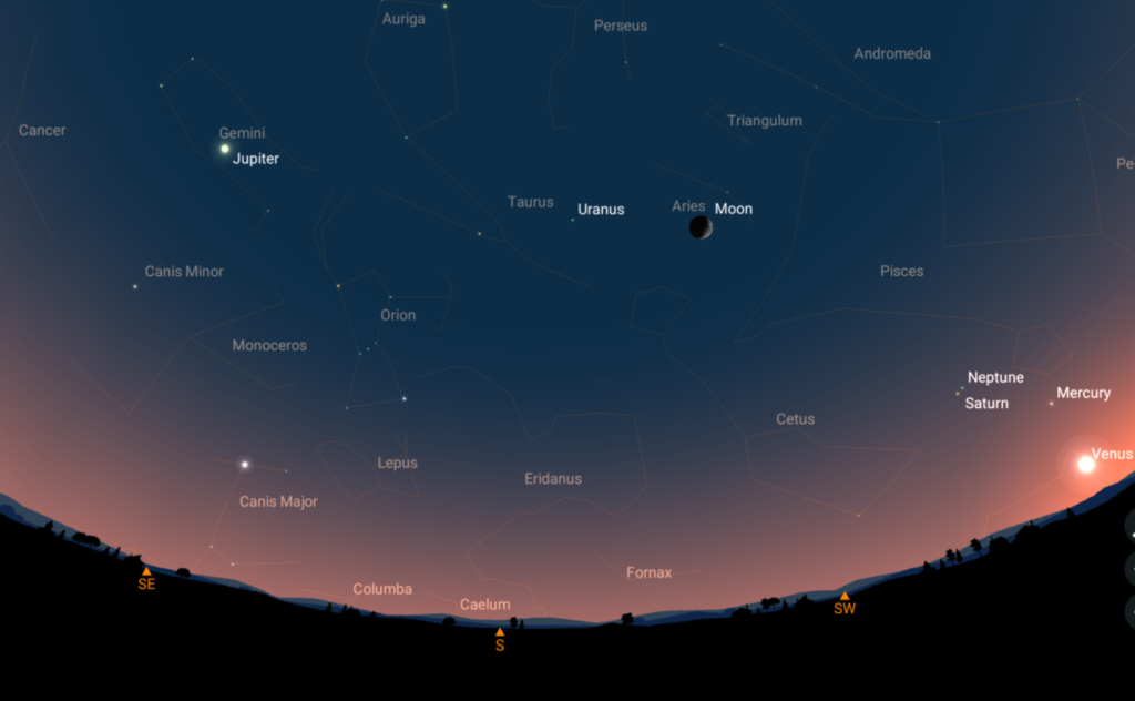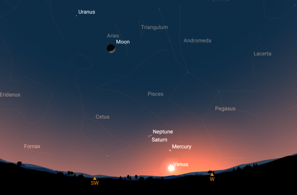 Vysoko nad jihozápadním obzorem pak bude skupinu planet doplňovat srpek Měsíce a o několik stupňů dál i Uran. I ten je k nalezení jen v dalekohledu (nebude ještě úplná tma, takže dalekohled je opravdu nezbytný).
