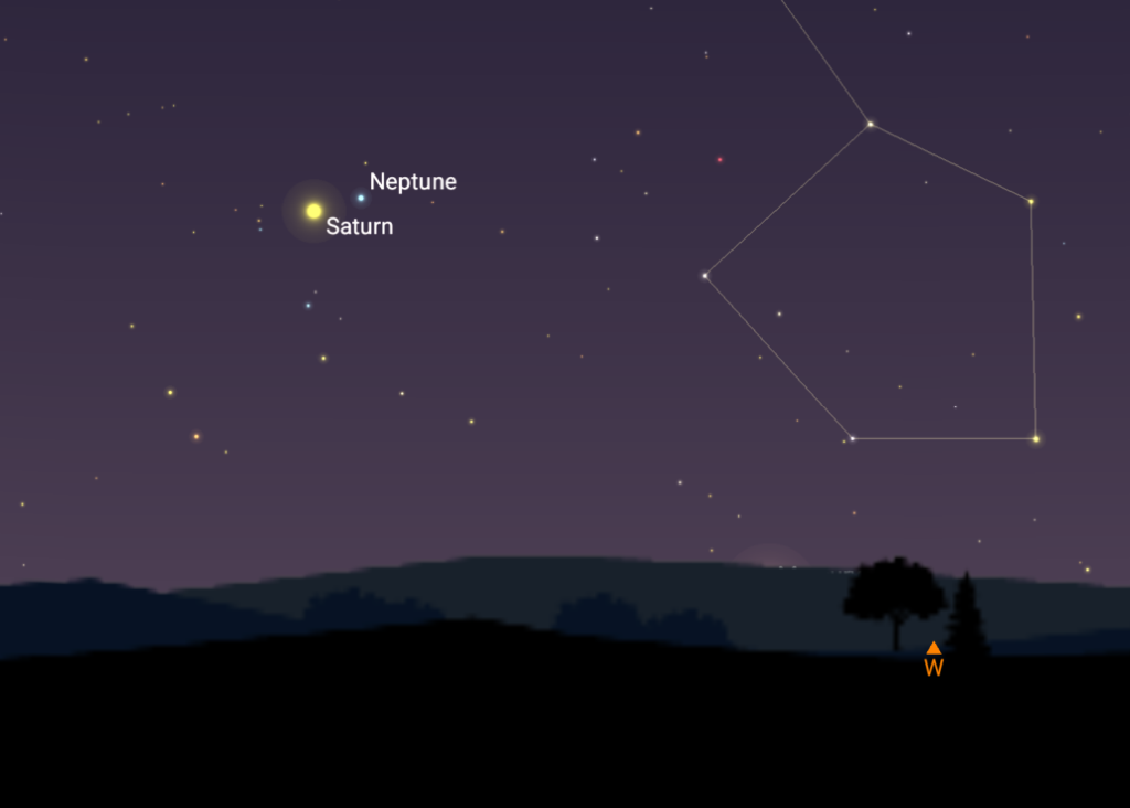 Po západu Slunce asi tak kolem 18 hodiny, se zadívejte nad západní obzor. Pokud máte výborný výhled a jasnou oblohu (ta tedy teď moc není), měli by jste nízko nad obzorem spatřit jasnou Venuši, nad ní slabě zářící Merkur a ještě o kus výš je také slabě zářivý Saturn a hned vedle něj Neptun. To je však první z planet v našem seznamu, která je viditelná jen v dalekohledu.