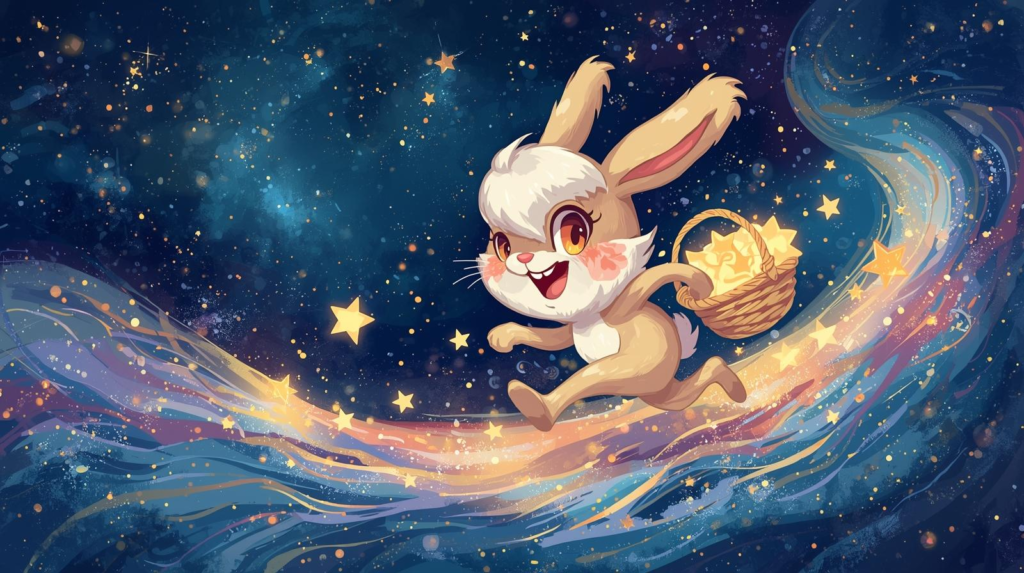 Vesmírný zajíc Arneb honem posbíral velikonoční hvězdičky do koše a utíkal s nimi před Velkým psem, který ho honil.